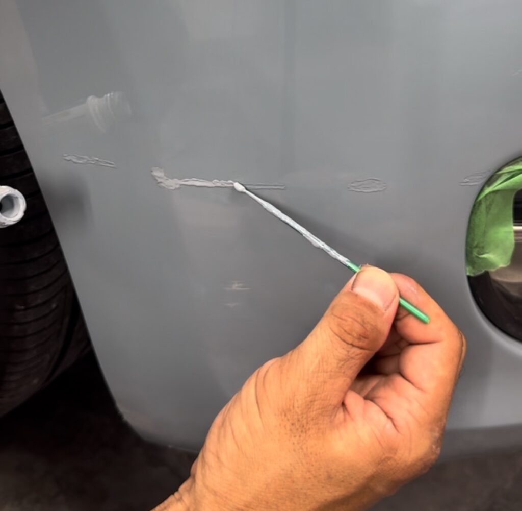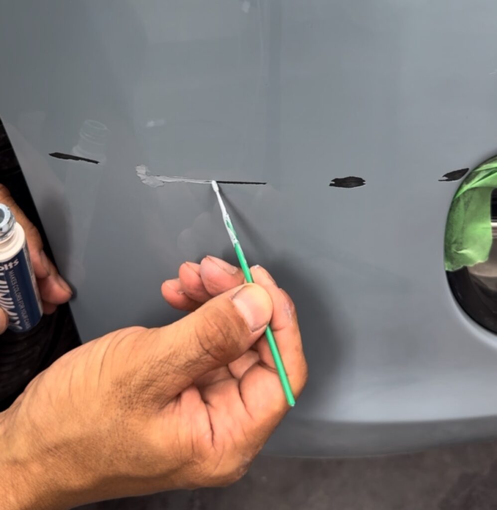 バンパーのガリ傷を、調色済みのタッチアップペンで補修していきます。