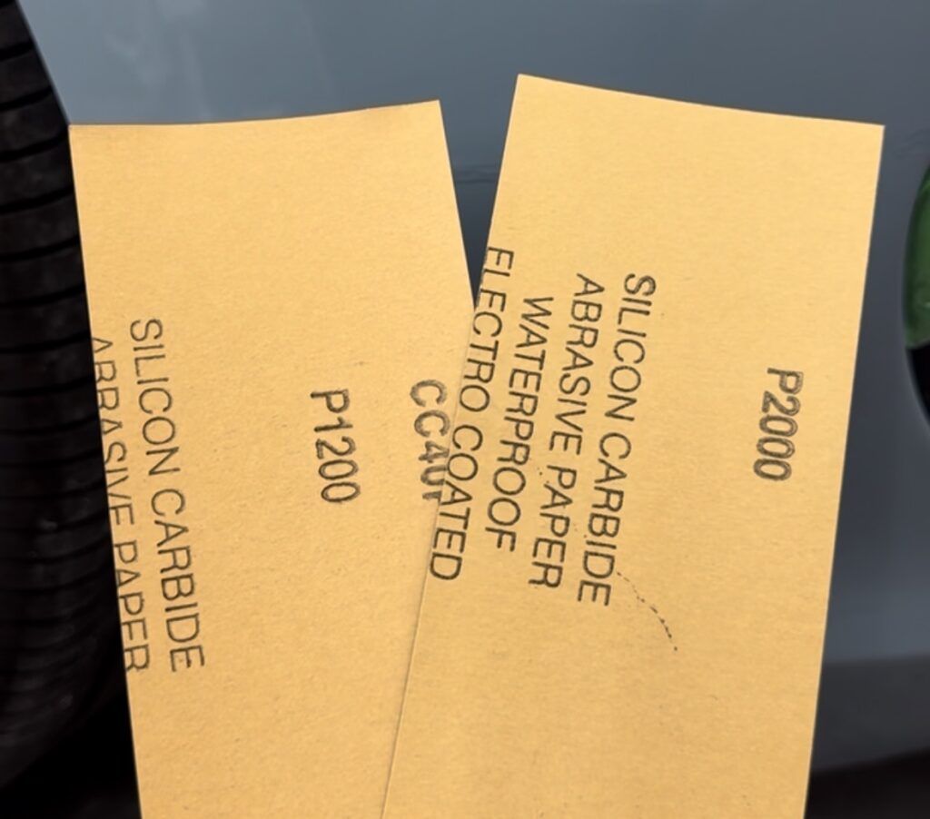 1200番ではピンポイントで塗った塗料を研磨して、2000番のペーパーでは当て木を使用して削ると平らに仕上がりやすいです。